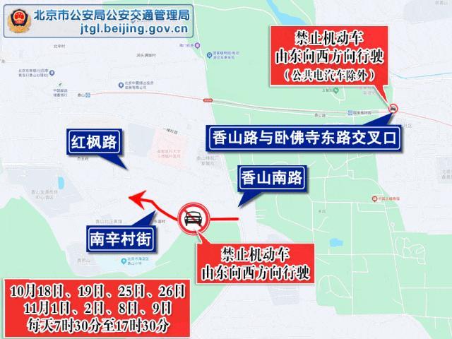 特别提醒大家,11月8日、9日,每天7时30分至17时30分,对香山地区南辛村街(香山南路至红枫路段)采取禁止机动车由东向西方向行驶的交通管理措施;对香山路与卧佛寺东路交叉口采取禁止机动车由东向西方向行驶(公共电汽车除外)的交通管理措施,届时将禁止游客自驾车沿香山路向上山方向通行。违反禁止通行措施的车辆,交管部门将通过现场与非现场执法手段强化查处。香山地区客流量持续保持在高位,周末期间周边停车场早7点前就已达到饱和状态,周边香山路上山方向、香泉环岛、旱河路南向北方向、西五环南向北方向、北五环东向西方向通行压力将尤为突出。交管部门建议赏红市民避开周末出游高峰,优先选择乘坐轨道交通节省步行距离。交管部门将增派警力做好香山地区维护疏导,优化车辆交通流线,视情况对区域内香泉环岛及周边五环路等道路采取单向通行、封闭出入口等临时交通管理措施,全力保障区域交通运行顺畅。交管部门还将通过广播、“北京交警”官方微博、室外电子显示屏、导航软件等渠道,及时发布实时交通路况信息,为大家提供出行引导服务。
