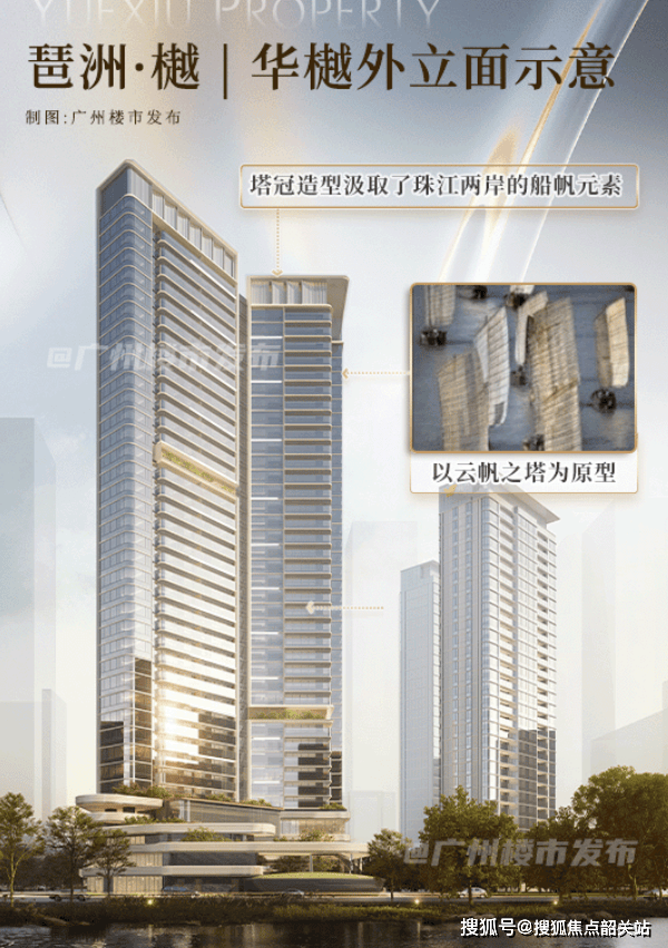 建筑外观设计由XAA冼剑雄建筑事务所操刀。冼剑雄先生及其团队曾主导设计了广州博物馆新馆等具有深远文化影响力的地标建筑,他们擅长将地域文化符号进行现代化的抽象提炼,赋予建筑以灵魂。在琶洲·樾|华樾的设计中,他们摒弃了繁复的装饰,转而追求一种极致的简约与力量感。整个建筑被通透的玻璃幕墙紧紧包裹,在阳光下熠熠生辉,宛如一位晶莹剔透的“水晶美人”。然而,若细细端详,你会发现其对称的造型极具深意,它像极了兩扇鼓满的风帆,蓄势待发,仿佛随时准备吹响号角,扬帆起航。这种“云帆之塔”的意象,不仅是对广州作为海上丝绸之路起点这一历史身份的深情致敬,更象征着新时代广州人敢为人先、勇立潮头的出海精神。建筑顶部的空中塔冠,更是通过精妙的意形设计,对船帆元素进行了进一步的抽象与升华,使得整栋建筑在干练挺拔的竖向线条衬托下,显得轻盈灵动而又气势磅礴。